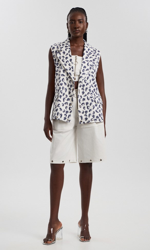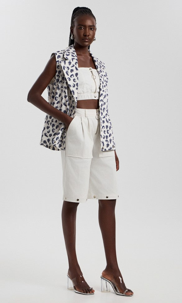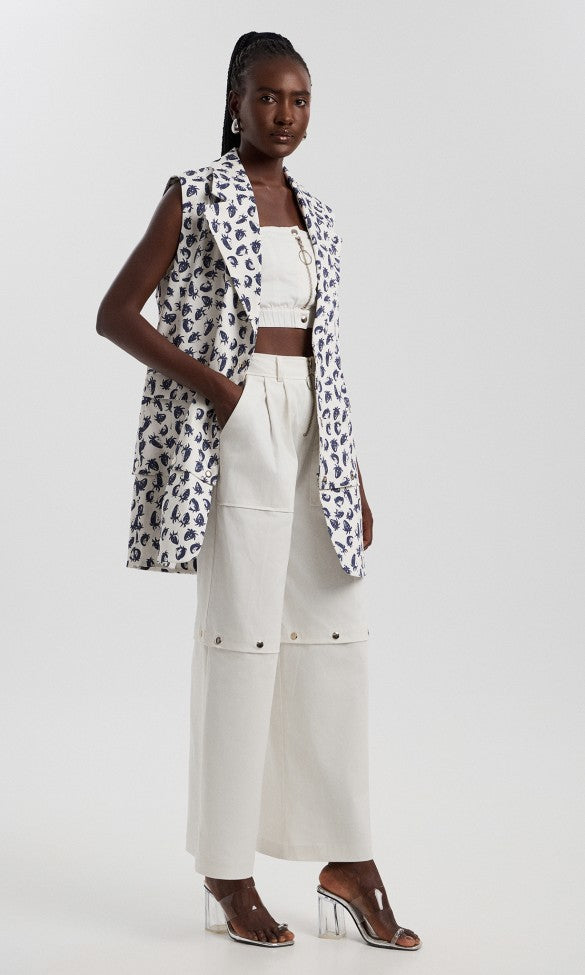 Το κομψό λευκό βαμβακερό γιλέκο, σχεδιασμένο με μεταλλικά κουμπιά σούστα για ρυθμιζόμενο μήκος και ευέλικτη εφαρμογή. Με λειτουργικές τσέπες με καπάκι και κολακευτικές ραφές πριγκίπισσας, αυτό το γιλέκο είναι ιδανικό για layering. Μετατρέψτε εύκολα το γιλέκο από μακρύ σε κοντό ρυθμίζοντας το στρίφωμα, καθιστώντας το ένα κομψό και προσαρμόσιμο βασικό κομμάτι της γκαρνταρόμπας.