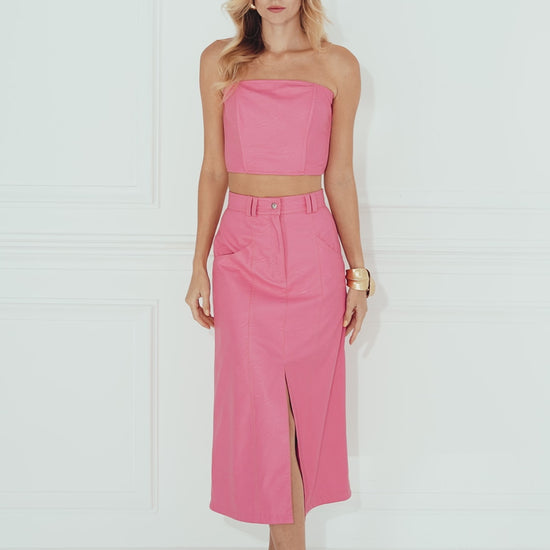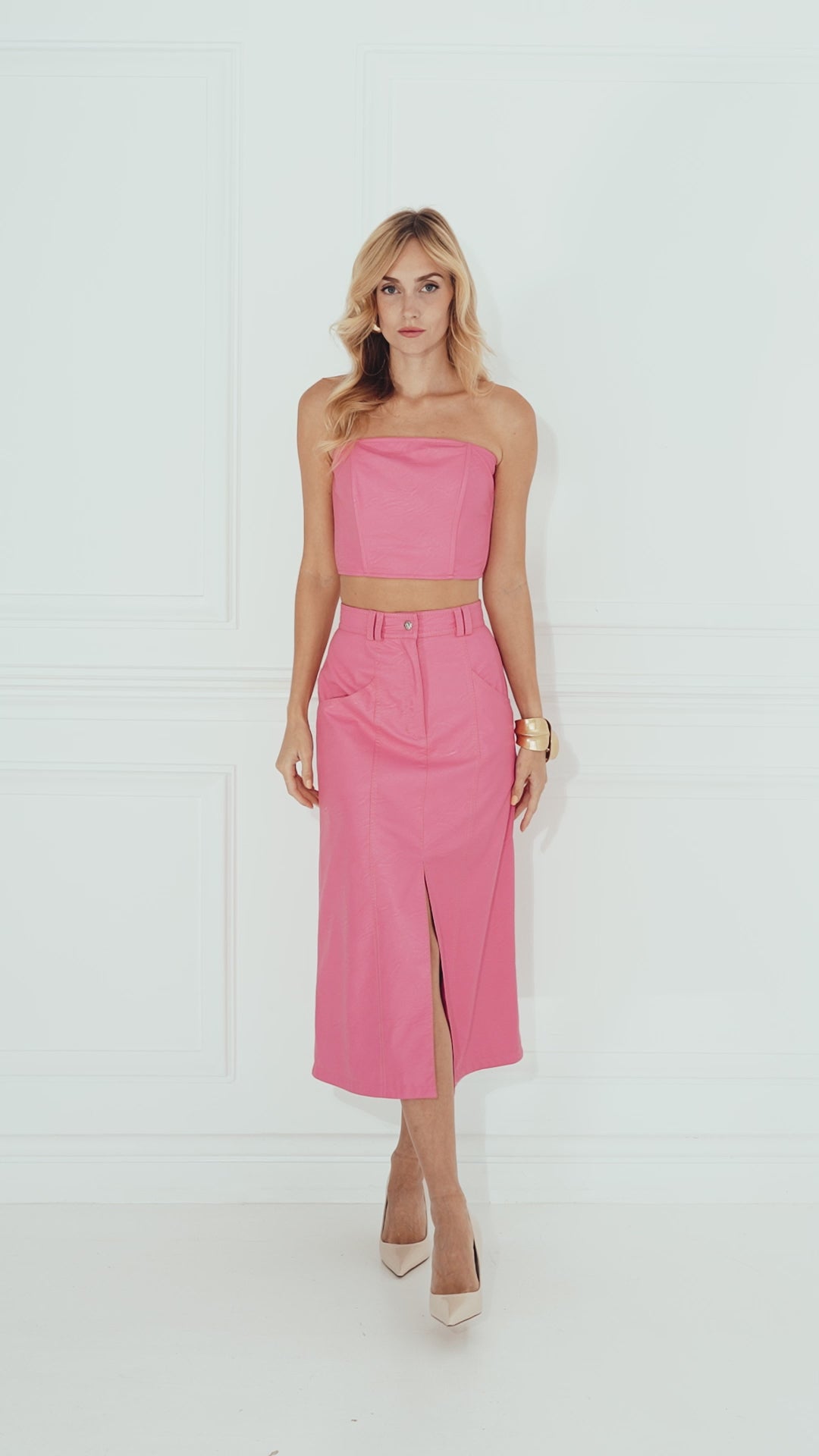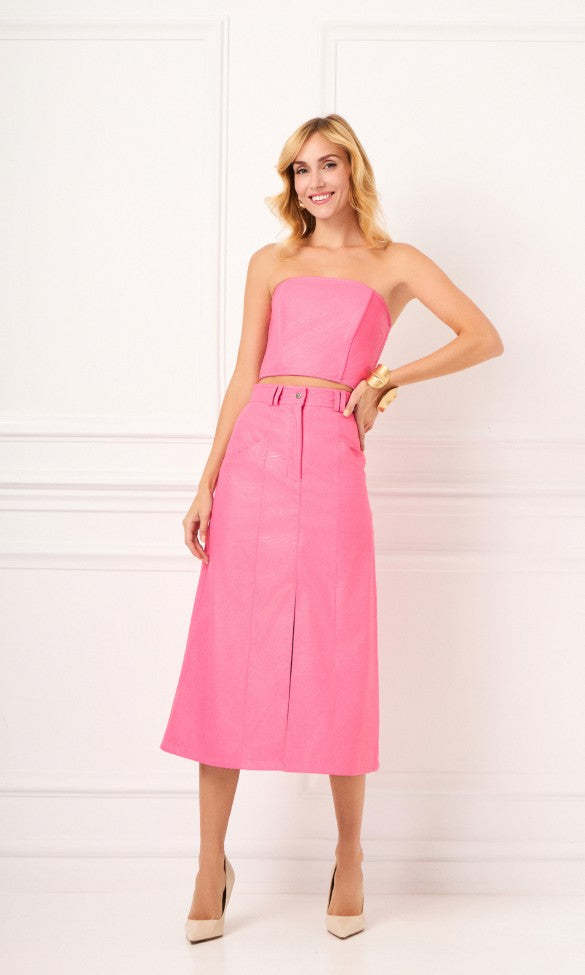 Φούστα από οικολογικό δέρμα σε ροζ χρώμα από την GEMMA. Αυτή η μίντι φούστα με ψηλή μέση συνδυάζει το σύγχρονο στυλ με τη βιωσιμότητα, κατασκευασμένη από οικολογικό δέρμα υψηλής ποιότητας για απαλή αλλά και δομημένη αίσθηση. Το σχέδιο διαθέτει κομψή μπροστινή σχισμή για ευκολία στην κίνηση και έντονη σιλουέτα, καθιστώντας την μια ευέλικτη επιλογή τόσο για πρωινές όσο και για βραδινές εμφανίσεις.