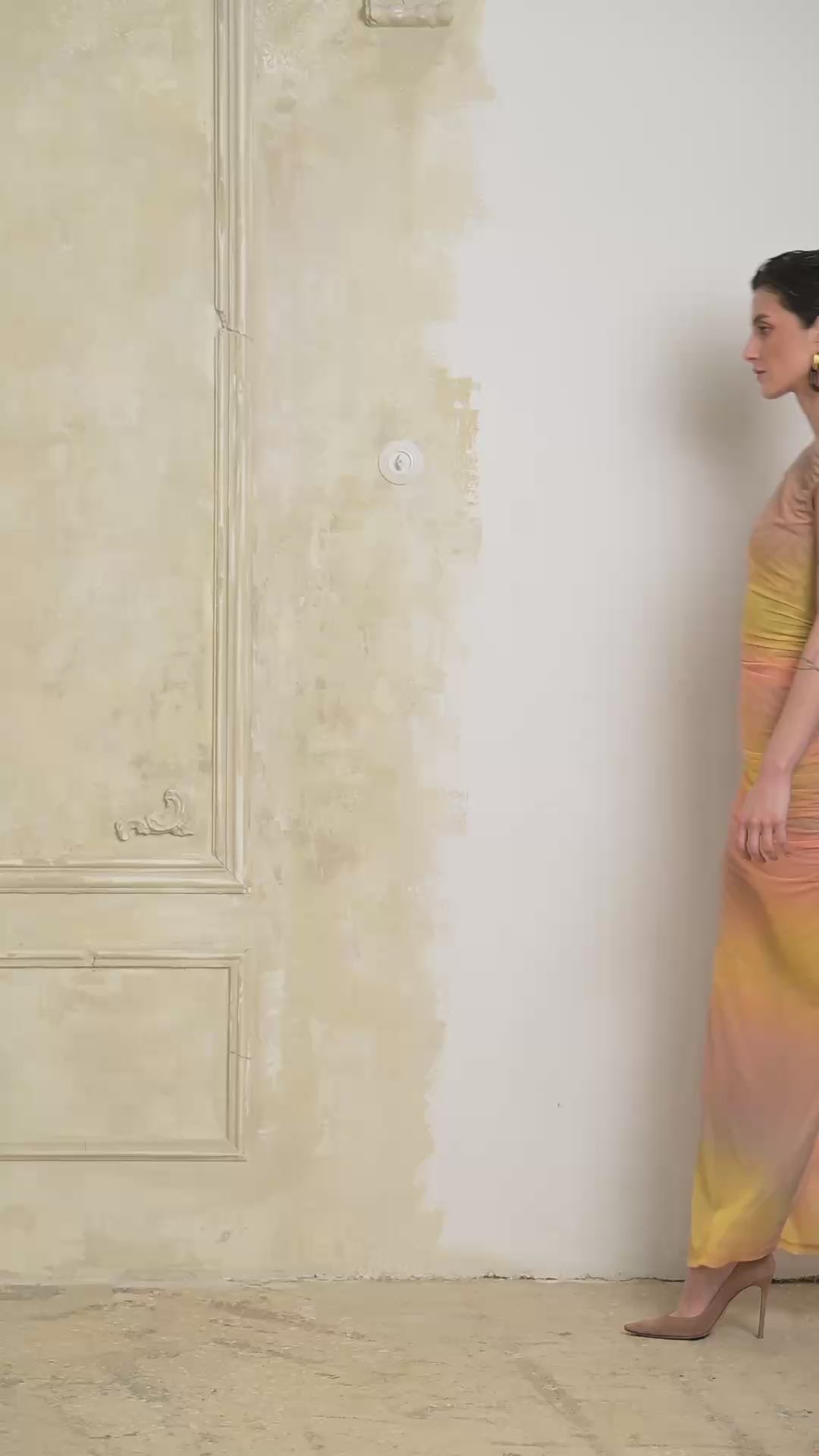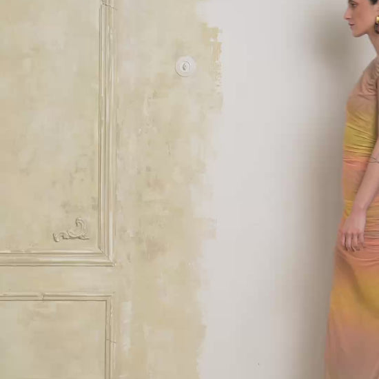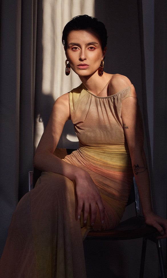 Αυτό το σαγηνευτικό φόρεμα διαθέτει μια εκπληκτική ντεγκραντέ εμπνευσμένη από το ηλιοβασίλεμα, που μεταβαίνει από χρυσοκίτρινο σε ένα βαθύ γήινο καφέ. Κατασκευασμένο από λείο, ανακυκλωμένο πολυεστέρα, είναι απαλό και άνετο στο δέρμα. Το σχέδιο περιλαμβάνει μια χαριτωμένη στρογγυλή λαιμόκοψη και μια κομψή, εφαρμοστή σιλουέτα που εκτείνεται σε μια μακριά φούστα, προσφέροντας μια κομψή και εκλεπτυσμένη εμφάνιση.