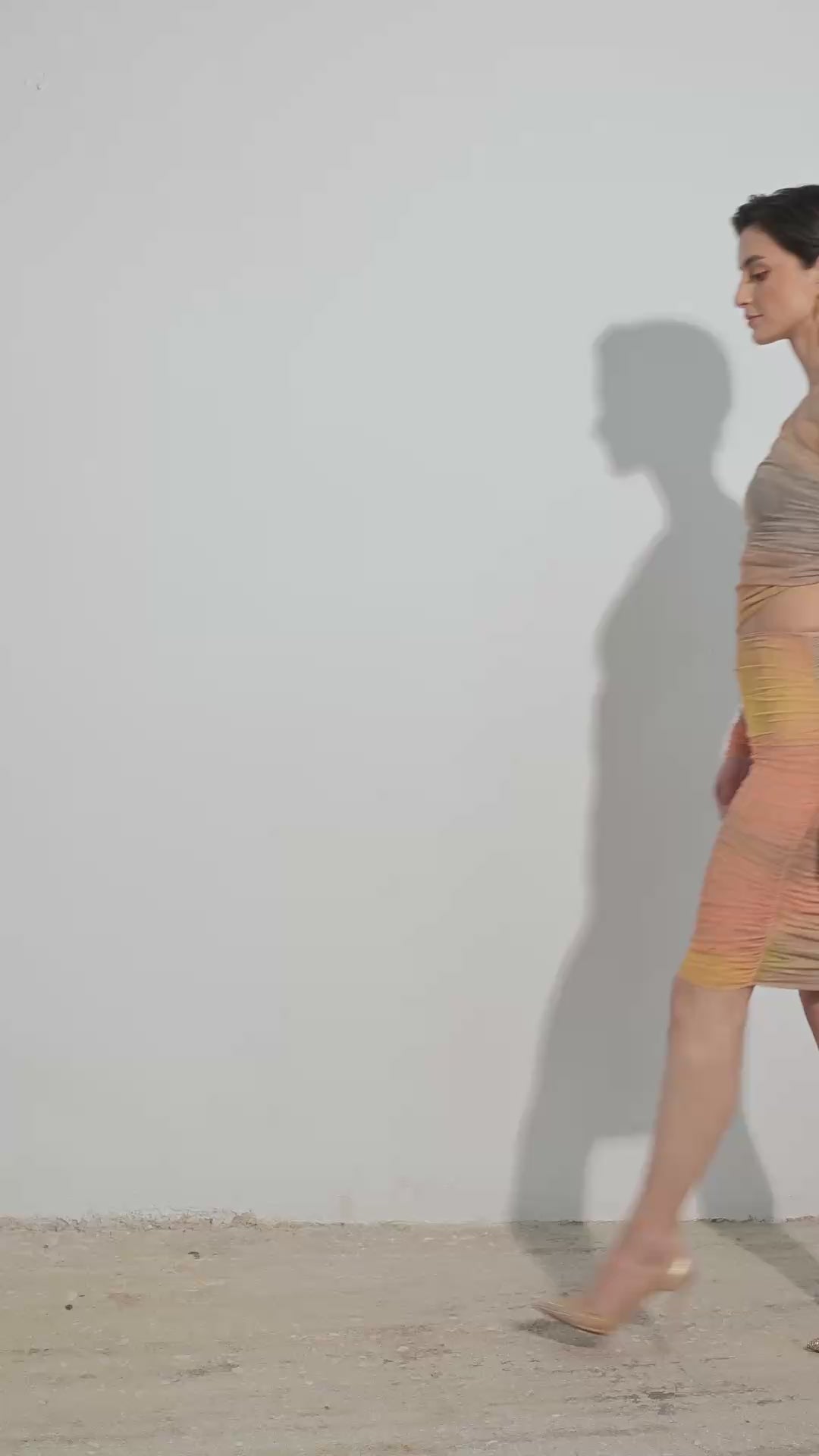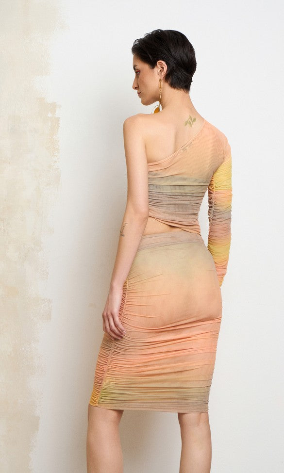 Θηλυκή, ελαστική πολύχρωμη φούστα από οικολογικό ανακυκλωμένο πολυεστέρα. Θα απολαύσετε μια εξαιρετικά απαλή αίσθηση στο δέρμα σας, ενώ παράλληλα θα αισθάνεστε άνετα. Το μοναδικό σχέδιο εφαρμόζει ομαλά στο σώμα και είναι εμπλουτισμένο με όμορφες εμφανίσεις. Η χρωματική διαβάθμιση εμπνευσμένη από το ηλιοβασίλεμα, που μεταβαίνει από χρυσοκίτρινο σε βαθύ γήινο καφέ, προσθέτει μια γλυκιά ατμόσφαιρα σε αυτή την εκπληκτική φούστα! Δώστε στυλ στη φούστα με το ασορτί τοπ με έναν ώμο για να έχετε ένα πραγματικά υπέροχο ντύσιμο!