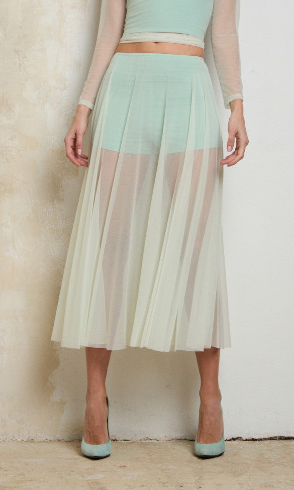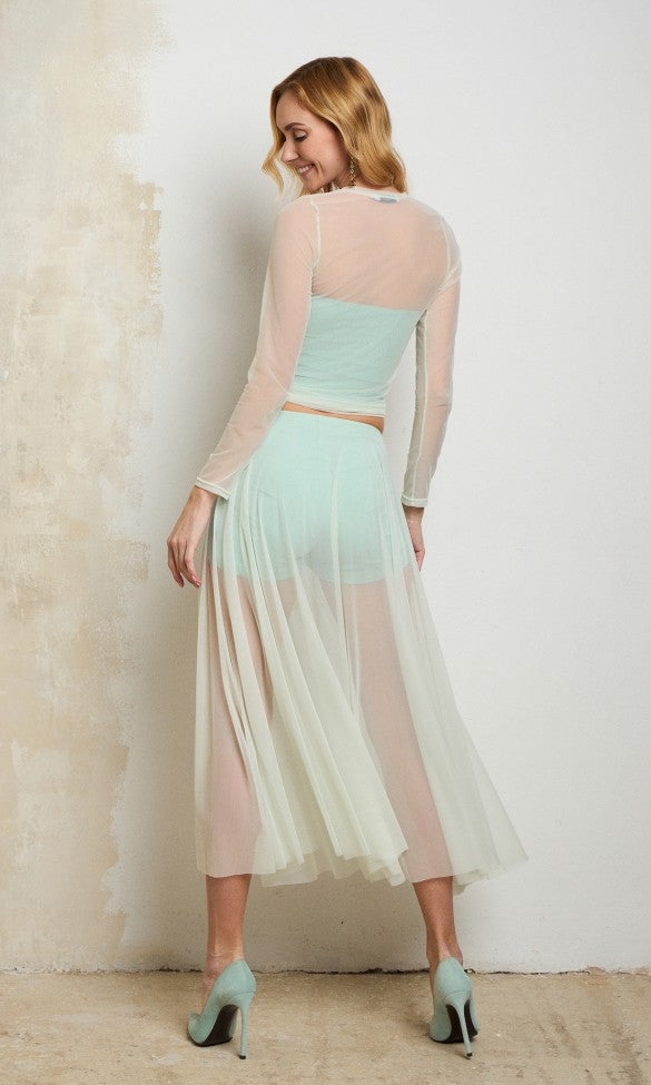 Η φούστα Iris Net σε χρώμα μέντας είναι μια σύγχρονη εκδοχή της αβίαστης κομψότητας. Αυτή η μίντι φούστα με ψηλή μέση διαθέτει ημιδιάφανο δίχτυ, προσθέτοντας διάσταση και μια πινελιά γοητείας. Ιδανική για κάθε περίσταση, η φούστα συνδυάζεται υπέροχα με τα πάντα, από κοντά πλεκτά μέχρι μπλούζες με τιράντες, εξασφαλίζοντας ευελιξία και κομψότητα σε κάθε εμφάνιση.