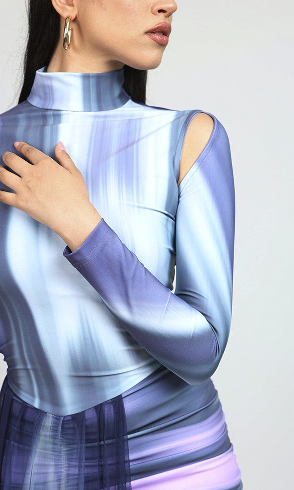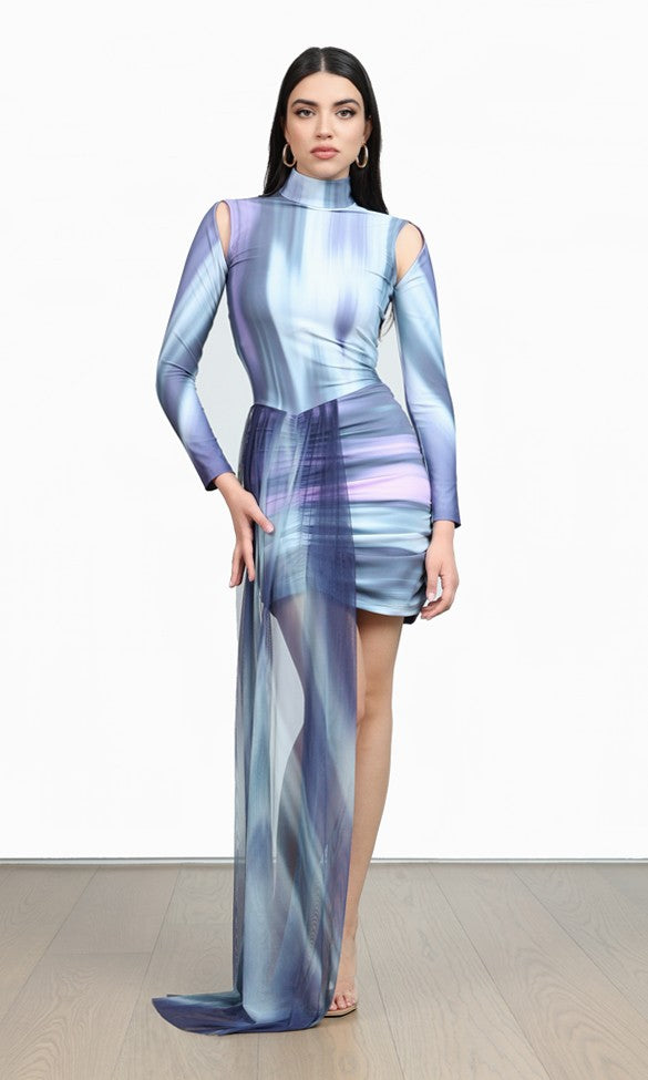 Αυτό το ελαστικό φόρεμα είναι ένα εκπληκτικό παράδειγμα βιώσιμης μόδας, σχεδιασμένο για να κάνει μια δήλωση στυλ σεβόμενο το περιβάλλον. Ο σχεδιασμός του φορέματος είναι καινοτόμος και κομψός, με ένα εφαρμοστό μίνι φόρεμα με ψηλό γιακά και ανοιχτούς ώμους, που του δίνουν μια μοντέρνα πινελιά. Αυτή η βασική στρώση τονίζεται από μια ρέουσα, διαφανή επικάλυψη που εκτείνεται σε μια φούστα μέχρι το πάτωμα, προσθέτοντας μια πινελιά δράματος και κίνησης στη σιλουέτα. Το φόρεμα συμπληρώνεται από μια λεπτή, λευκή καπιτονέ τσάντα με λουράκι αλυσίδας, ενισχύοντας την κομψότητά του.