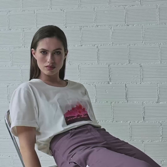 High-waisted pants made from 100% organic cotton, sustainably dyed in a rich dark purple. Featuring silver-tone snap buttons along the sides for adjustable slits, these relaxed-fit pants are both eco-friendly and versatile, perfect for casual or dressed-up styles