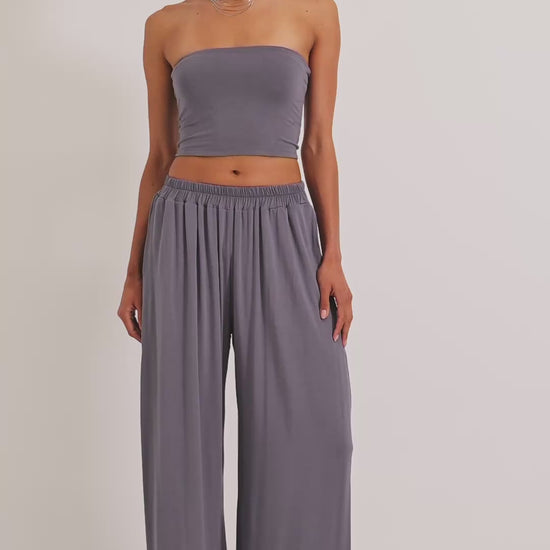 The Lydia Pants in grey are a perfect blend of elegance and comfort, crafted from 100% bamboo fabric for a soft, breathable feel. Designed with a high-waisted, wide-leg silhouette and an elastic waistband for a relaxed yet sophisticated look, these pants drape beautifully, making them an essential wardrobe staple. Ideal for day-to-night wear, they offer effortless style with a touch of sustainability.